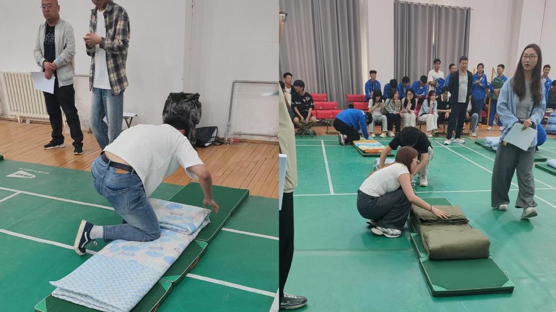 “块乐生活”叠军被大赛现场气氛热烈,充满竞技与趣味。活动前期,学院邀请退伍学生开展“叠军被技巧培训课”,通过现场示范、手把手教学,向同学们传授叠军被的要领,从铺平被子、折叠边角到压出棱角,每一个步骤都进行了细致讲解。